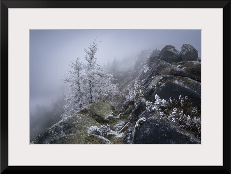 <p>Hoar frosted trees and freezing fog at The Roaches rock formation in Winter, The Roaches, near Leek, Peak District National Park, Staffordshire Moorlands, Staffordshire, England, United Kingdom, Europe</p>