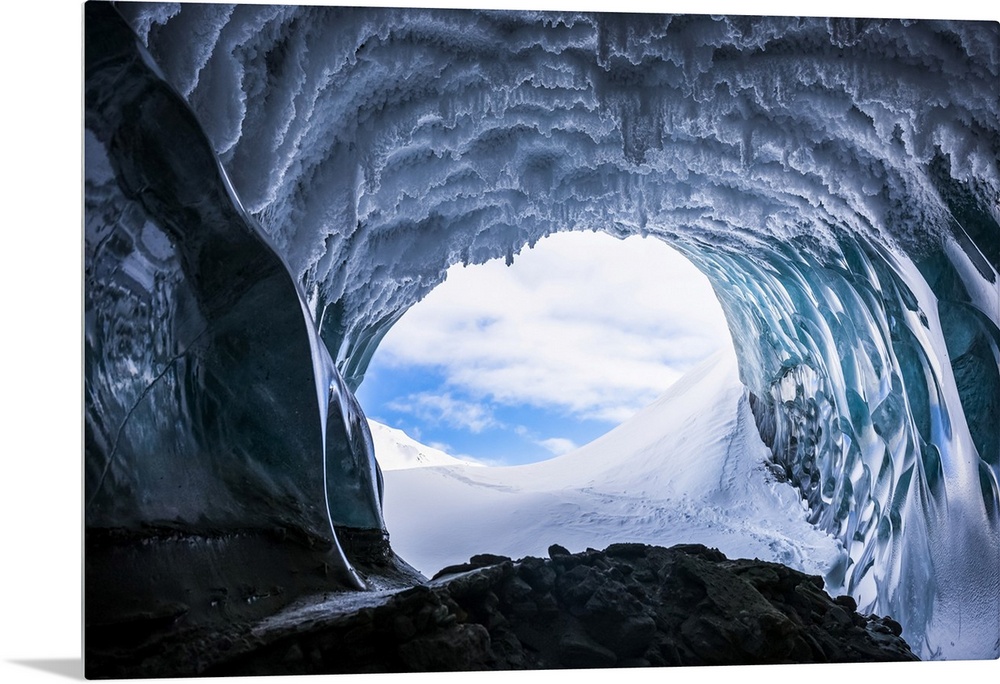 <p>Hoarfrost hangs from the ceiling of a Canwell Glacier ice cave in winter; Alaska, USA</p>