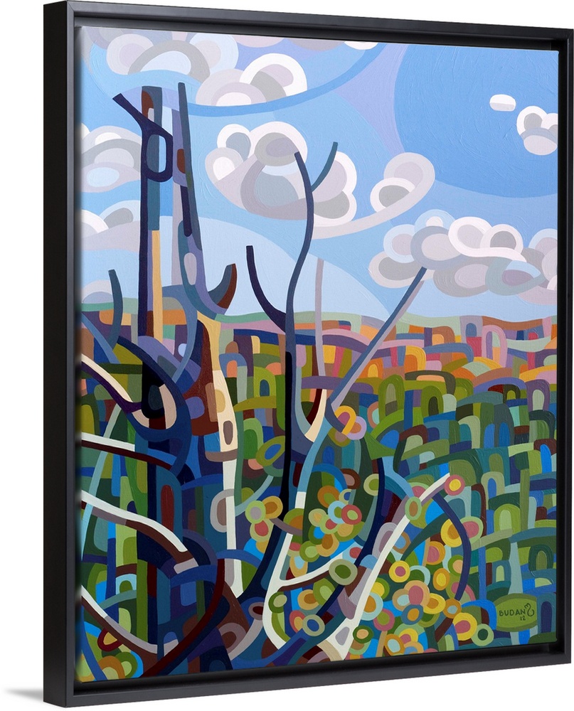 <p>Mandy Budan’s art style is more than unique. Using acrylic colors to weave lines and shapes together like a tapestry, she creates breathtaking images from the simplest forms. Though the multicolored dots of “Standing Room Only” may seem like a scattering of disparate, broken circles up close, a step back reveals a stunning forest scene reminiscent of stained glass. In “Solitaire,” a close examination reveals an intricate collection of interlocking pieces, almost like peeking at the delicate harmony of gears in a pocket watch. Yet again, a step away from the canvas transforms her design into an unrestricted dance of fluid lines and curves in a blossom. Whether it’s the soft floral pinks of “Cascade,” the gold turning crimson in “Stormlight,” or the sweeping blues of “Thaw,” wall art from Mandy Budan adds more than color to a room; it invites visitors to discover something new each time they encounter it.</p>
