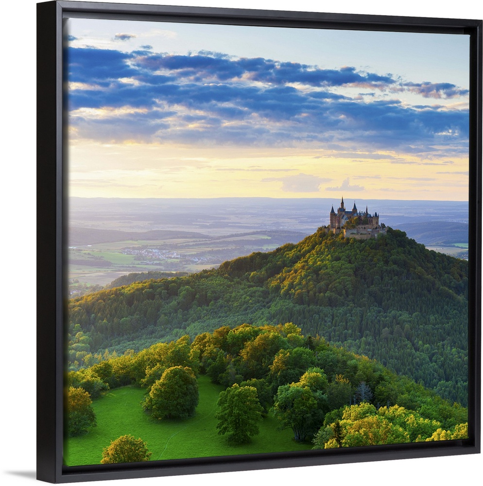 <p>Elevated view towards Hohenzollern Castle and sourrounding countryside illuminated at sunset, Swabia, Baden Wuerttemberg, Germany</p>