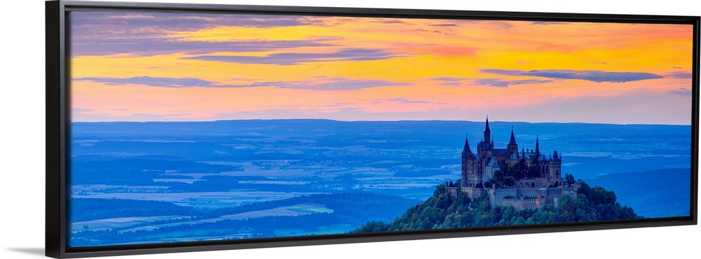 <p>Elevated view towards Hohenzollern Castle and sourrounding countryside illuminated at sunset, Swabia, Baden Wuerttemberg, Germany</p>