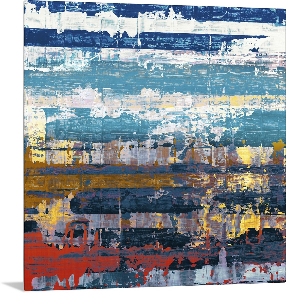<p>Contemporary abstract home decor artwork using blues and reds in distressed conditions.</p>