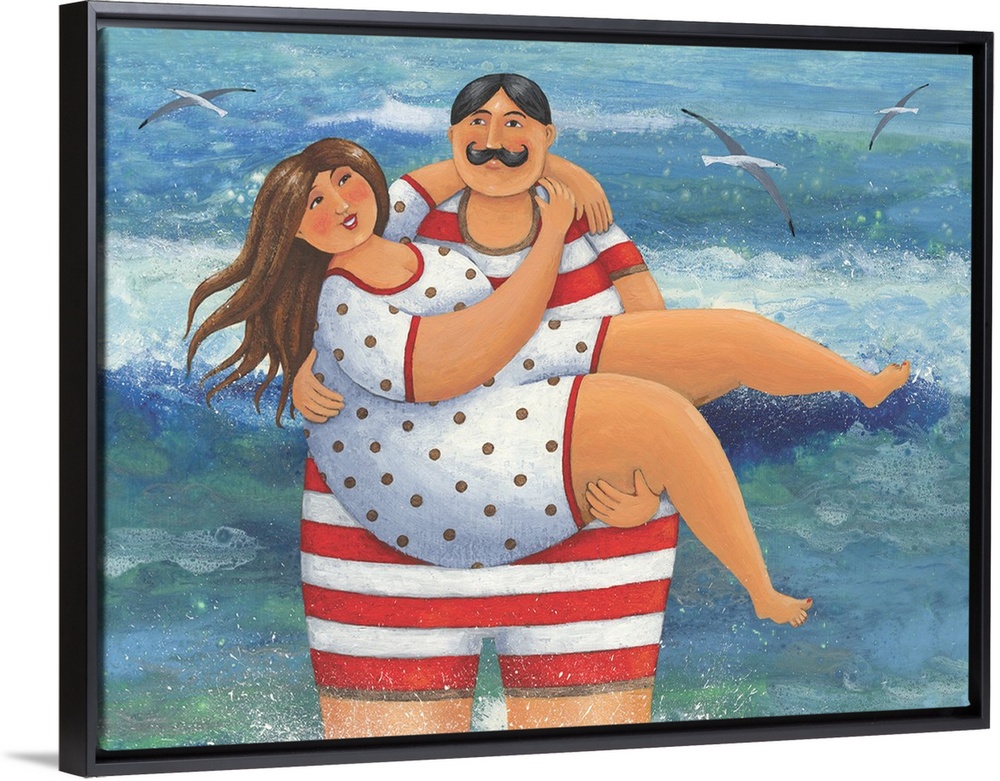 <p>Nautical themed painting of man in a bathing suit holding a woman in a bathing suit.</p>
