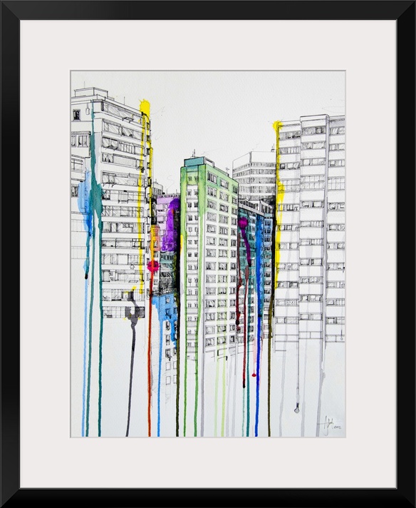 <p>Watercolor and ink painting of several tall buildings in a city with small splashes of color.</p>