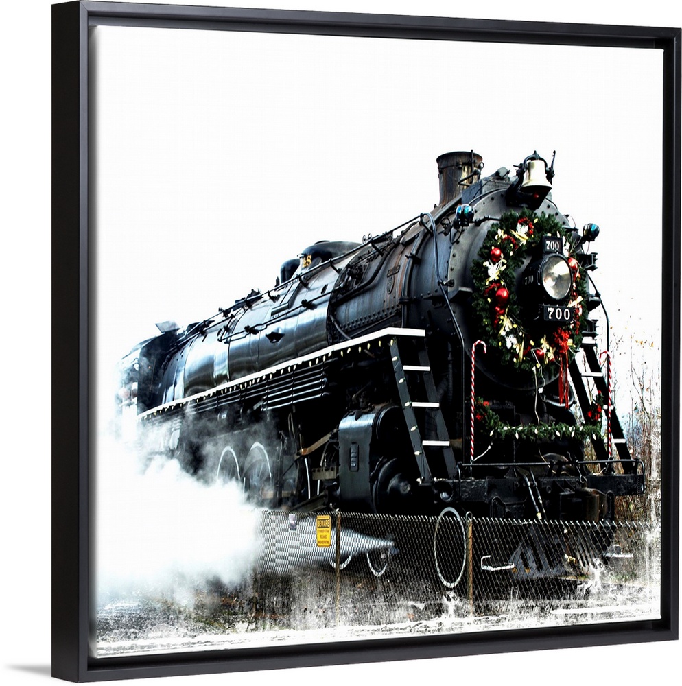 <p>A black locomotive with a festive wreath on its nose.</p>