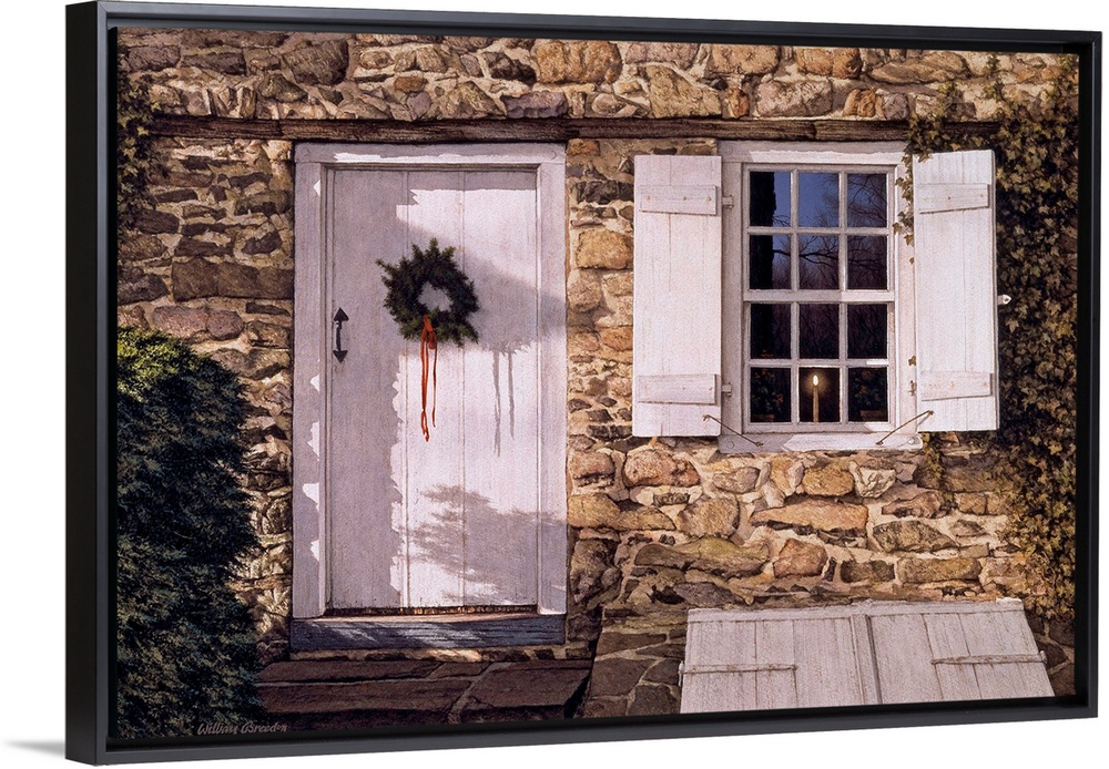 <p>Pennsylvania architecture- front of stone house with white doors and shutters and a wreath on the door.</p>