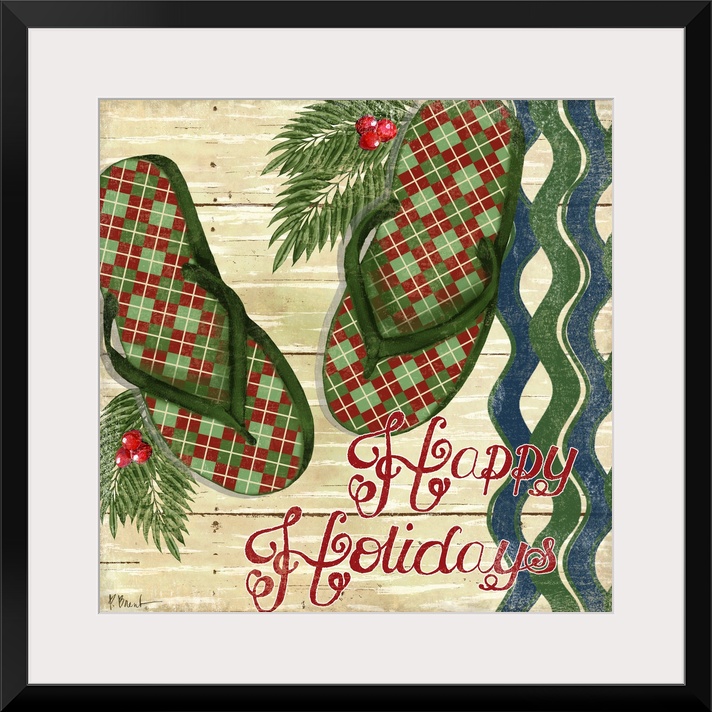 <p>A pair of plaid-patterned holiday flip-flops decorated with holly and the words "Happy Holidays."</p>