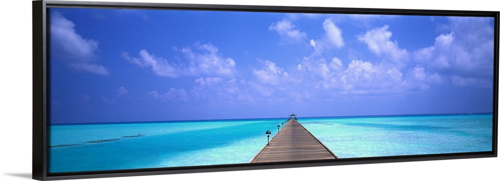 <p>Giant panoramic photo of a wooden pier stretching into the horizon in Holiday Island in the Maldives. The wooden pier is surrounded by crystal clear water and sky.</p>