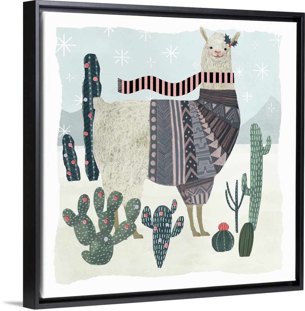 <p>An amusing llama wearing a patterned sweater walks through a desert with cacti in this decorative artwork.</p>