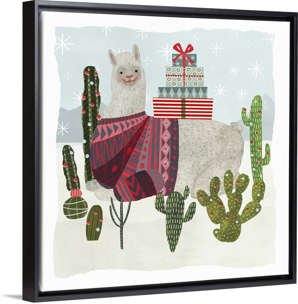 <p>An amusing llama wearing a patterned sweater sits in a desert with cacti in this decorative artwork.</p>