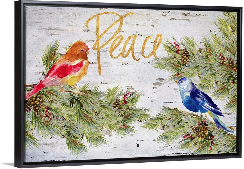 <p>Holiday watercolor painting of two birds perched on pine tree branches with pine cones and red berries on a distressed wooden background with the word "Peace" written at the top in metallic gold.</p>