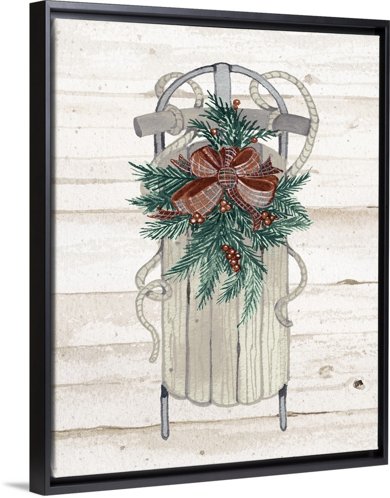 <p>Seasonal decor with a watercolor painted sled decorated with pine needles, berries, and a bow, on a wooden background.</p>