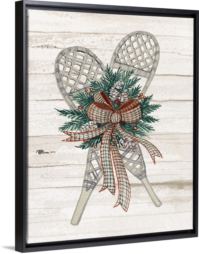 <p>Holiday wreath with snowshoes on a off white planked wall.</p>