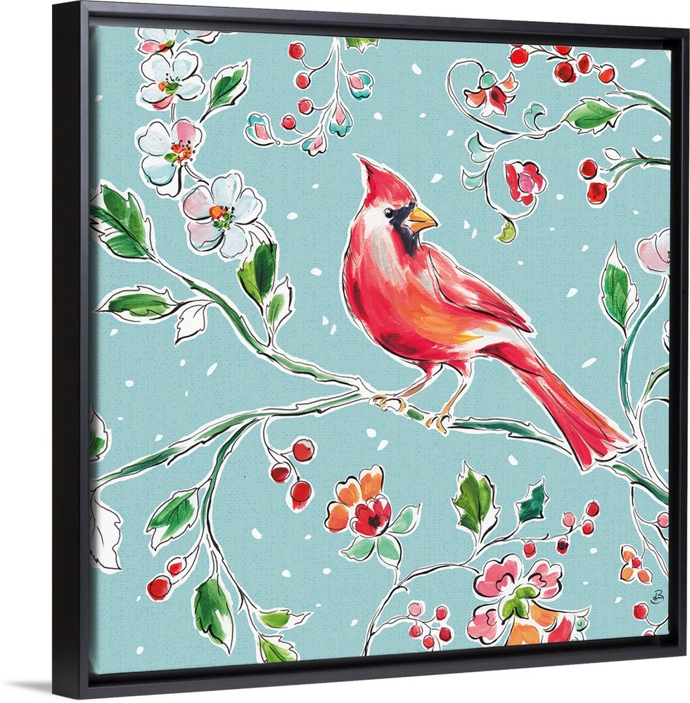 <p>Seasonal decor of a cardinal perched on a branch with flowers and berries on a light blue background with snow falling.</p>