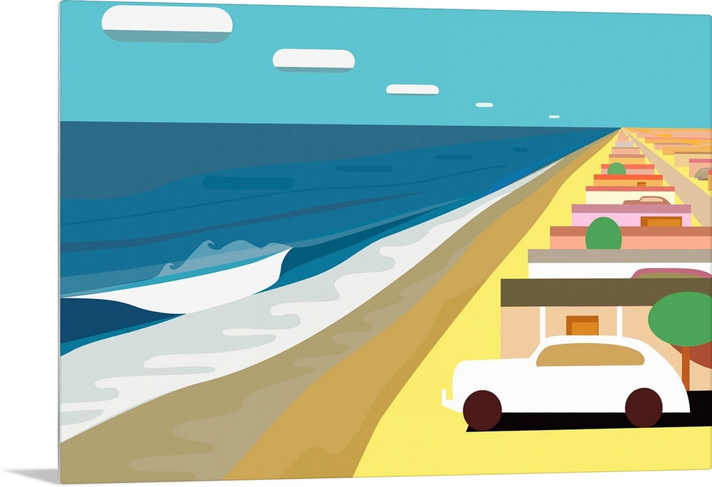 <p>A horizontal digital illustration of a beach with rows of cottages and a parked car.</p>