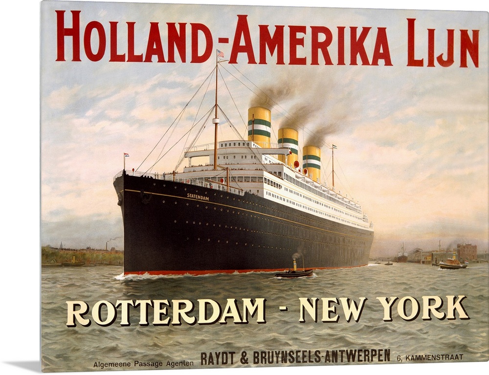 <p>Advertisement for travel by ship from Netherlands to the United States. The ocean liner has three striped chimneys.</p>
