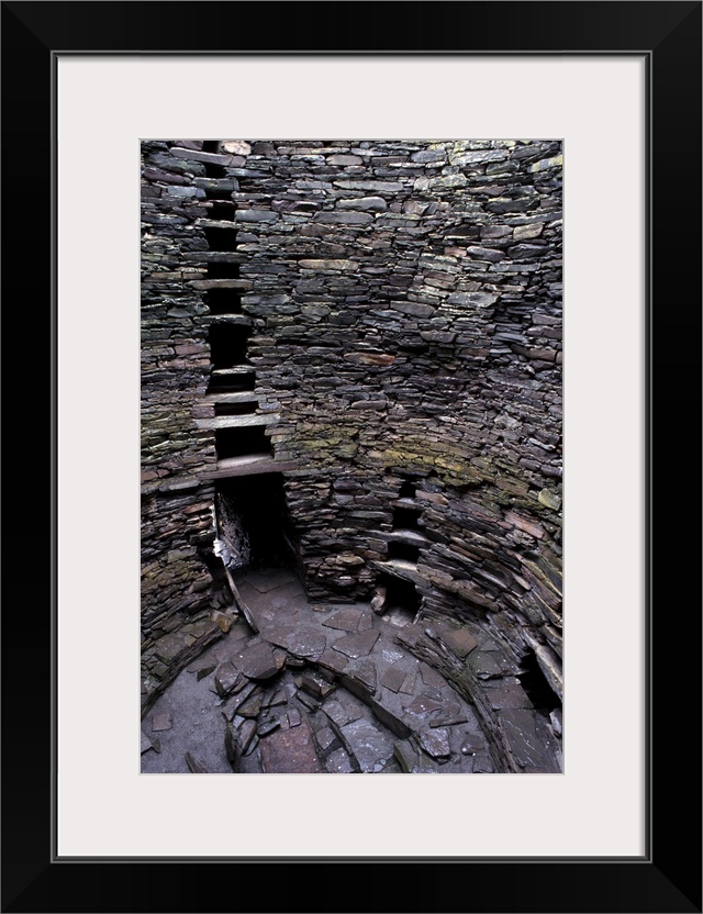 <p>Hollow walls and water tank, Mousa Broch, best preserved of all brochs, standing 12-13 m high, in perfect state, due to its isolation, Mousa Island, Shetland Islands, Scotland, United Kingdom, Europe</p>