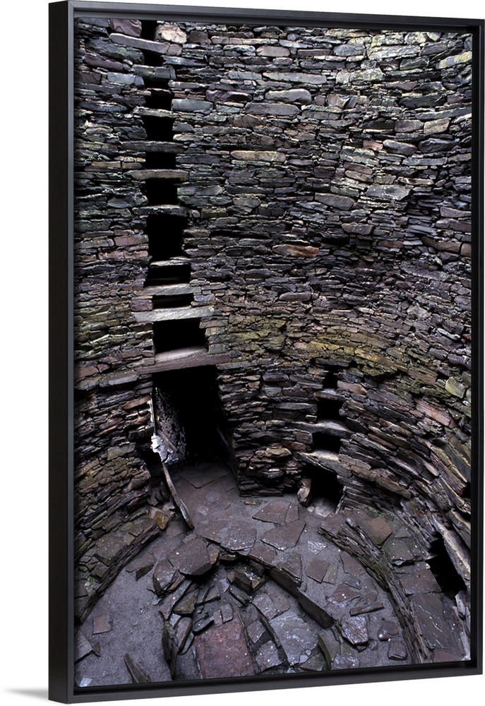 <p>Hollow walls and water tank, Mousa Broch, best preserved of all brochs, standing 12-13 m high, in perfect state, due to its isolation, Mousa Island, Shetland Islands, Scotland, United Kingdom, Europe</p>