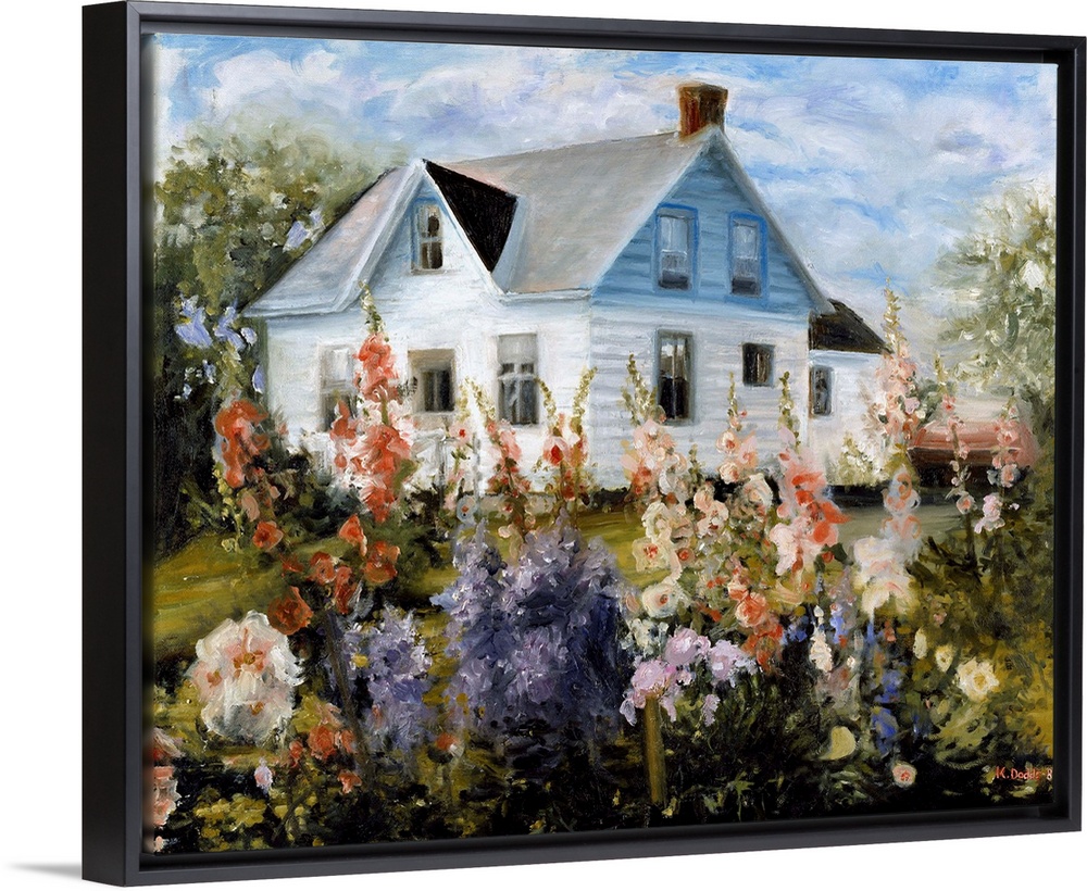 <p>Contemporary artwork of hollyhocks in front of a rustic country building.</p>
