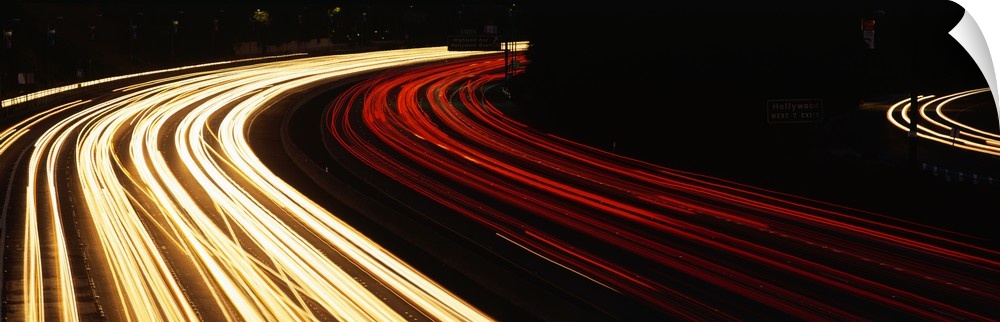 <p>Trails of car lights on the busy Hollywood Freeway in the evening in California.</p>