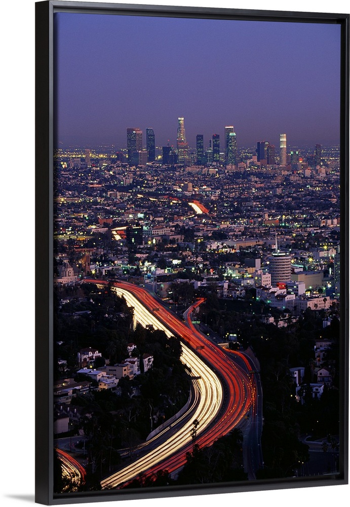 <p>Vertical panoramic of highway running through busy west coast metropolis with city skyline in distance at dusk. The highway is covered with light trails from moving cars and the night sky is filled buildings lit up.</p>