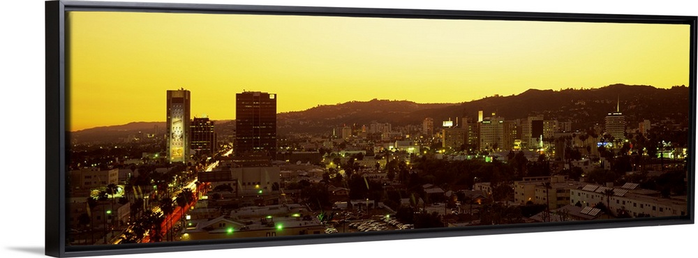 <p>Oversized, high angle photograph of the Hollywood Hills, lit up at sunset, in Hollywood California.</p>