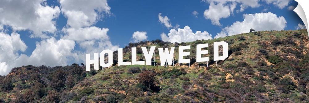 <p>Hollywood Sign changed to Hollyweed, at Hollywood Hills, Los Angeles, California, USA</p>