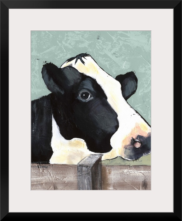 <p>Contemporary portrait of a black and white dairy cow with a sweet expression.</p>
