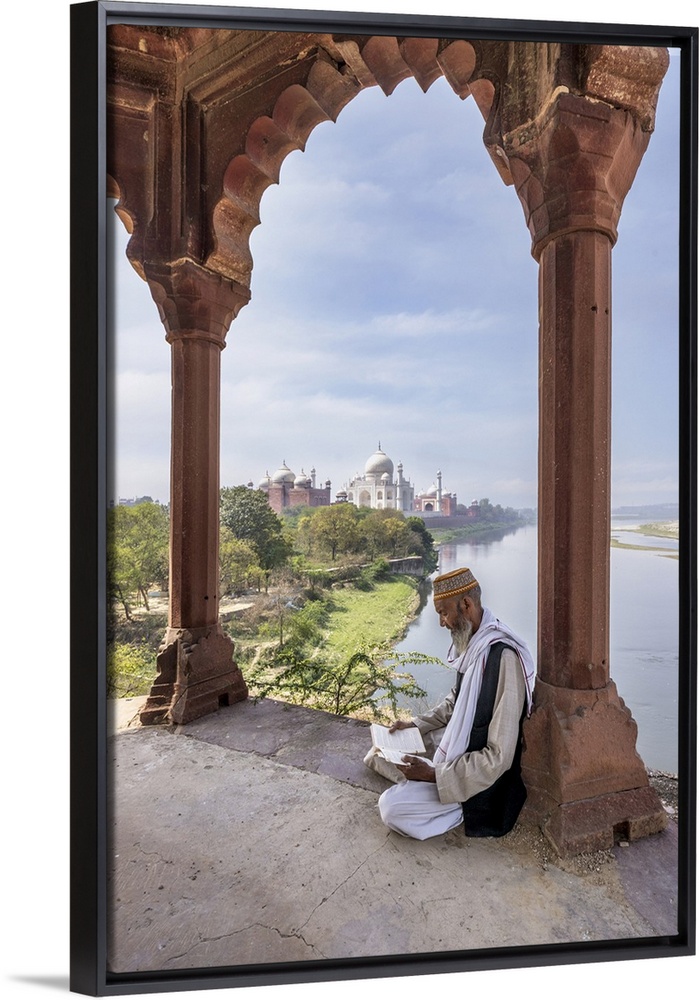<p>Holy Man reading relgious book by the Taj Mahal</p>