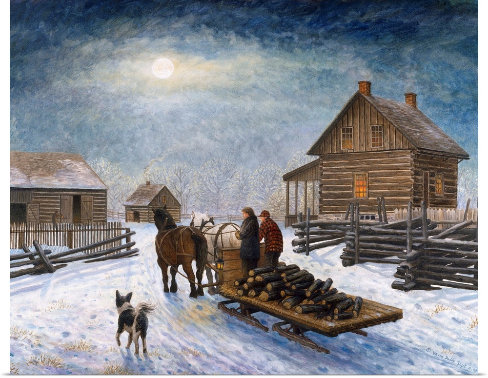 <p>Contemporary artwork of horses pulling a sled full of logs back to the farm.</p>