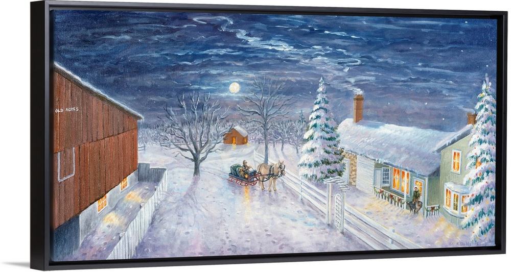 <p>Contemporary artwork of a horse and sleigh coming home at night.</p>