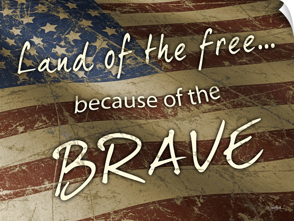 <p>"Land of the Free Because of the Brave" on a rustic waving American flag.</p>