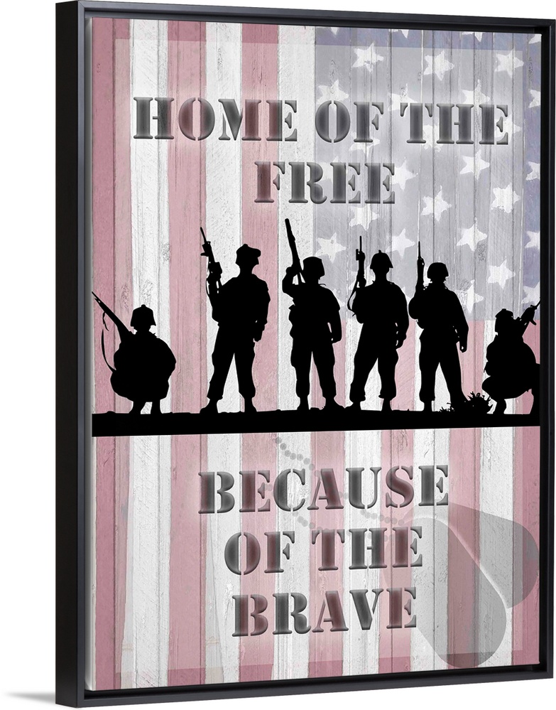 <p>A silhouetted row of soldiers over an image of the American Flag.</p>