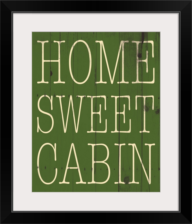 <p>Typographical artwork with "Home sweet cabin" in a thin rustic text.</p>