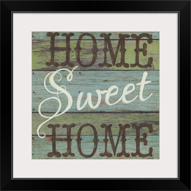 <p>A decorative square painting that says ?Home Sweet Home? on a blue and green striped wooden background.</p>