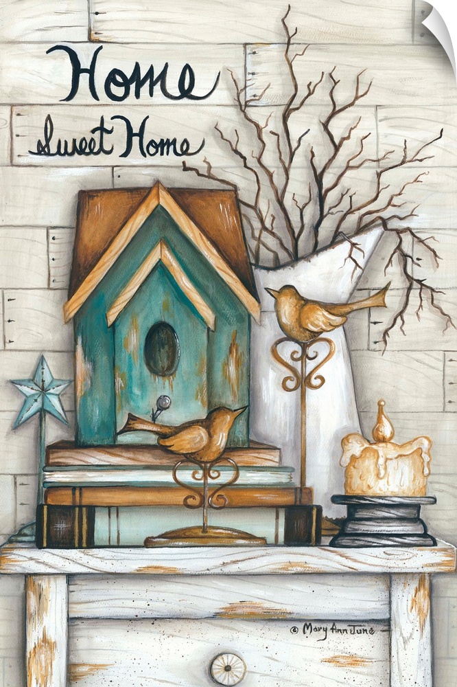 <p>A side table filled with farmhouse items including bird figurines and a birdhouse.</p>