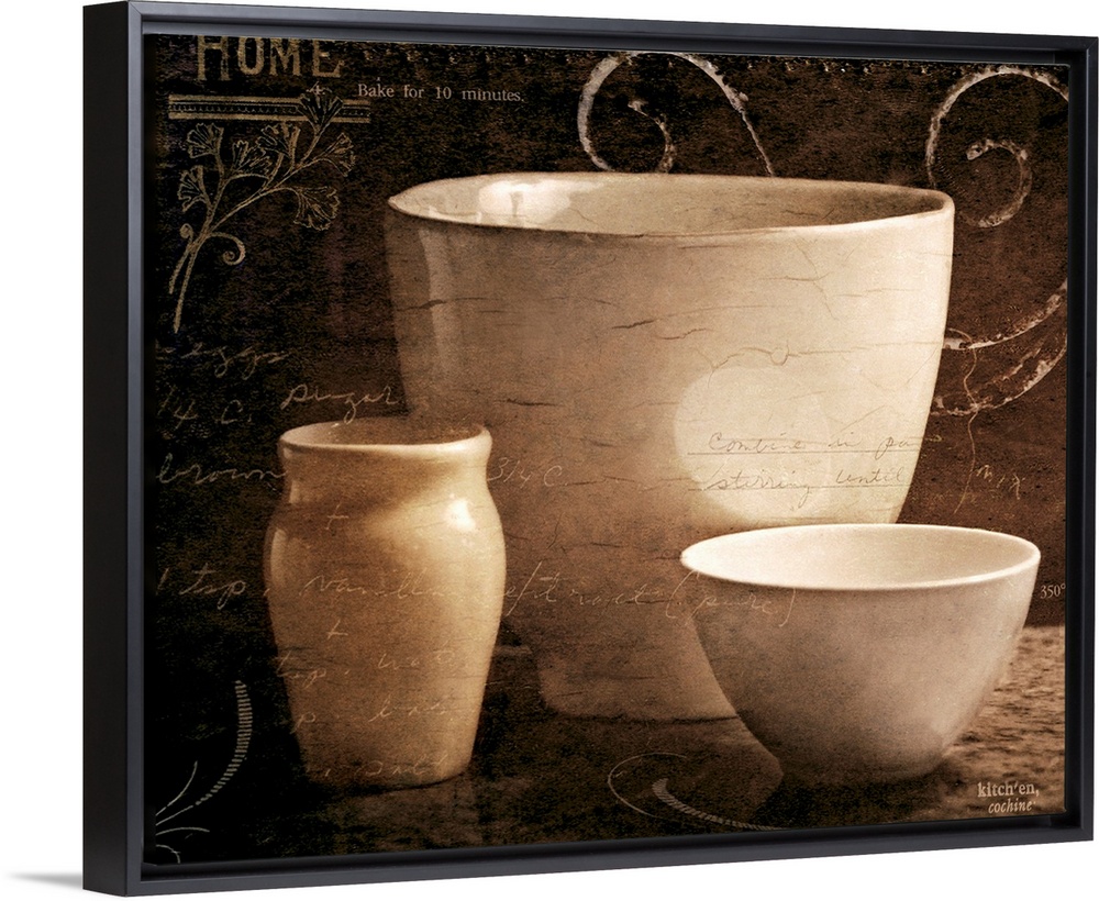 <p>Home artwork featuring text and designs over three bowls sitting on a table. Neutral tones dominate.</p>