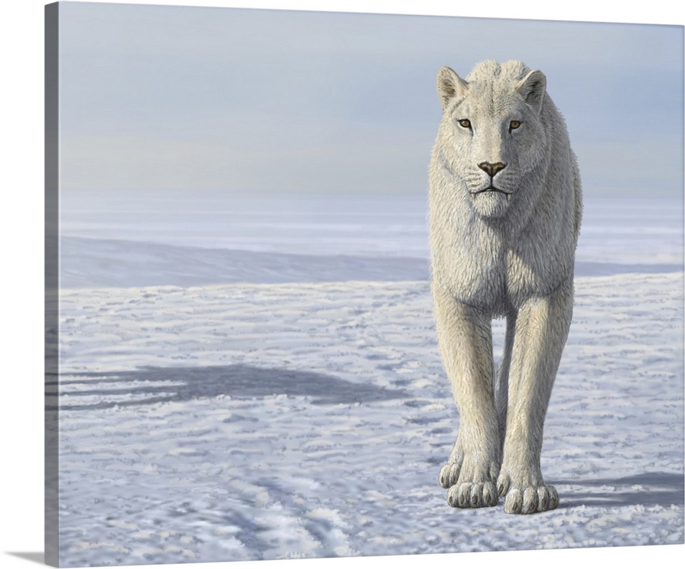 <p>Homotherium sabretooth cat in the Arctic, illustration. This extinct prehistoric mammal lived from 4 million to 12,000 years ago, from the Early Pliocene to the Late Pleistocene. It was a powerful predator, reaching a shoulder height of around 1.1 metres. Its fossils have been found in the Americas, Eurasia, and Africa. This illustration shows the hypothesis that the animal could have evolved a white coat as an adaptation to hunt in the snow.</p>