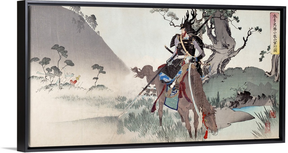 <p>Honda Tadakatsu at Komaki. Detail from a 19th-century woodblock illustration showing legendary Japanese samurai Honda Tadakatsu on horseback following his victory at the Battle of Mount Komaki in 1584. Honda Tadakatsu is wearing his distinctive antlered battle helmet and carrying his famous spear known as 'tonbo giri' or Dragonfly Cutter (said to be so sharp that a dragonfly landing on it would be cut in half). Tadakatsu saw Toyotomi Hideyoshi and his men in pursuit of his Lord Tokugawa Ieyasu, and despite being heavily outnumbered, challenged them successfully at the banks of the Shonai River to allow Ieyasu to escape safely. Toyotomi Hideyoshi was said to have been so struck by the bravery of this warrior, he ordered that no harm come to him or his men. The artwork is by Toshikata Mizuno (1866-1908) who studied under Yoshitoshi.</p>
