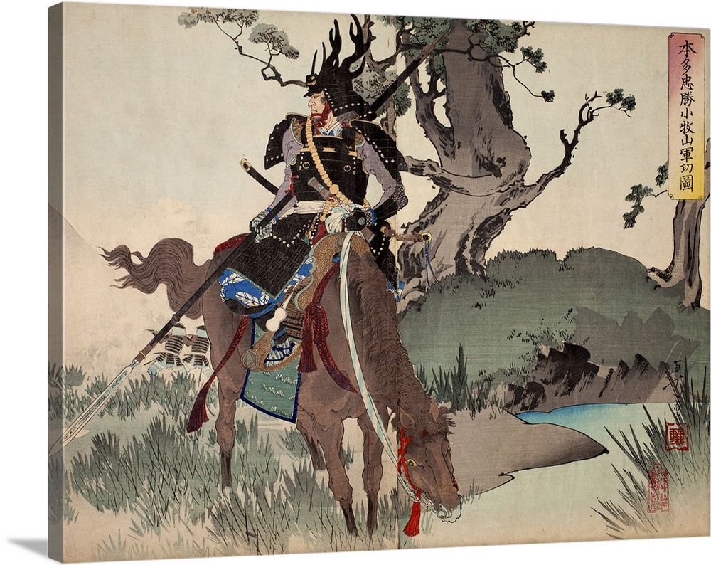 <p>Honda Tadakatsu at Komaki. Detail from a 19th-century woodblock illustration showing legendary Japanese samurai Honda Tadakatsu (1548-1610) on horseback following his victory at the Battle of Mount Komaki in 1584. Honda Tadakatsu is wearing his distinctive antlered battle helmet and carrying his famous spear known as 'tonbo giri' or Dragonfly Cutter (said to be so sharp that a dragonfly landing on it would be cut in half). Tadakatsu saw Toyotomi Hideyoshi and his men in pursuit of his Lord Tokugawa Ieyasu, and despite being heavily outnumbered, challenged them successfully at the banks of the Shonai River to allow Ieyasu to escape safely. Toyotomi Hideyoshi was said to have been so struck by the bravery of this warrior, he ordered that no harm come to him or his men. The artwork is by Toshikata Mizuno (1866-1908) who studied under Yoshitoshi Tsukioka.</p>