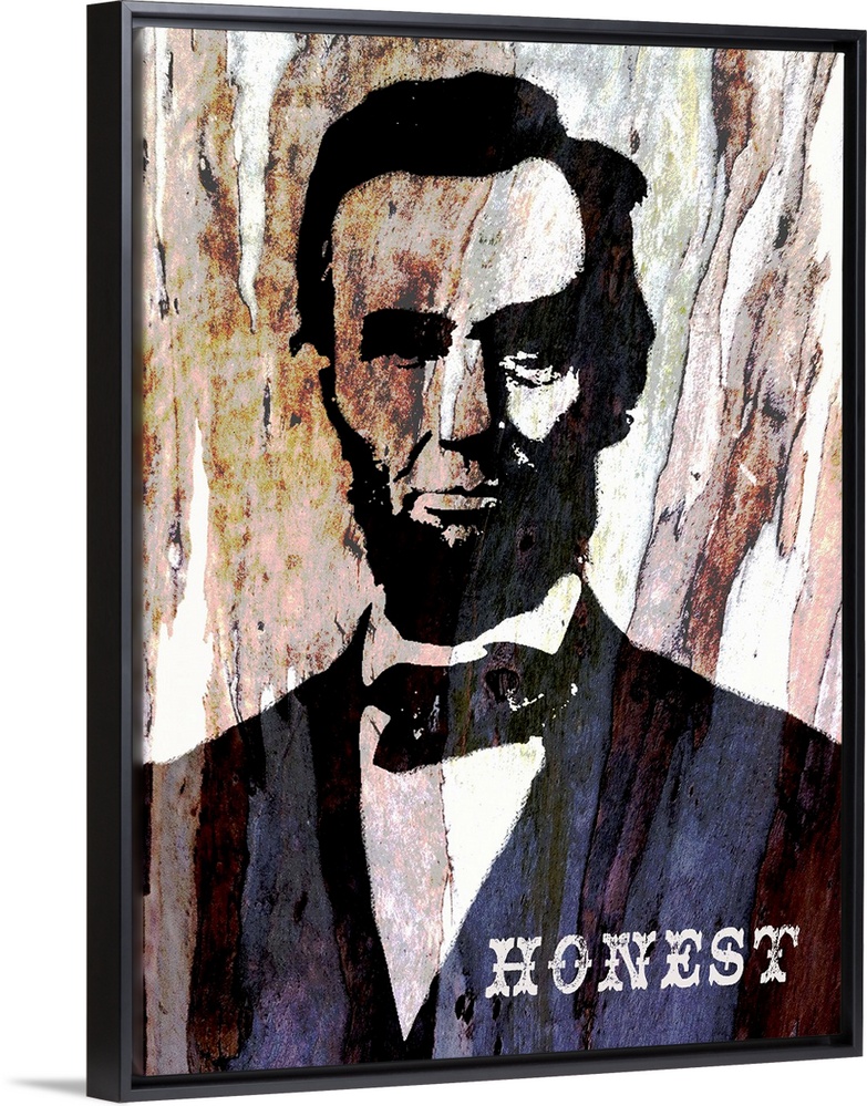 <p>Graphic portrait of President Abe Lincoln with the word Honest on his chest and a tree trunk bark for a background.</p>