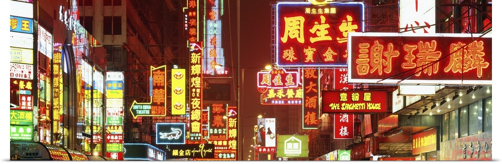 <p>Wide angle photograph on a large canvas of many brightly lit neon signs, at night in Hong Kong, China.</p>
