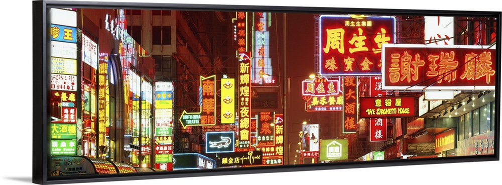 <p>Wide angle photograph on a large canvas of many brightly lit neon signs, at night in Hong Kong, China.</p>