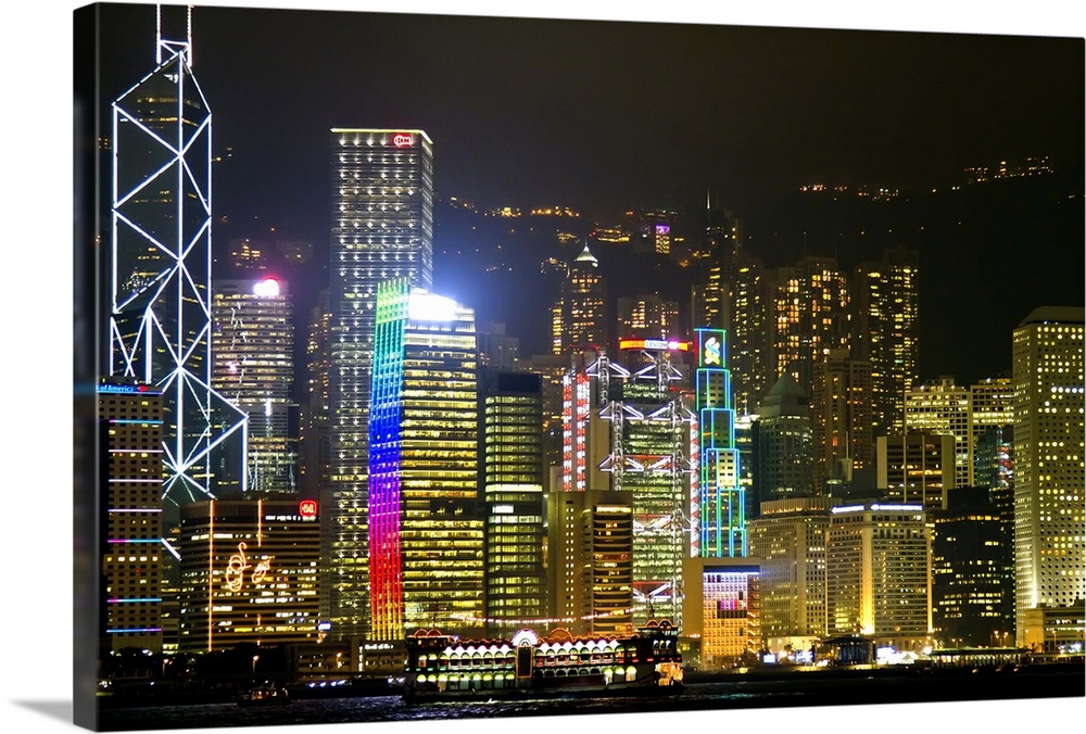 <p>Hong Kong city at night during the light and laser show. The view is from the Kowloon 'Avenue of Stars' looking directly towards the city, with various ferries and water craft illuminated on the harbour.</p>