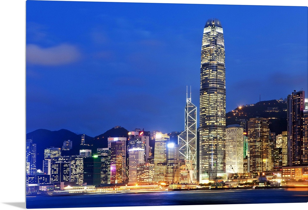 <p>China, Hong Kong, Hong Kong island, City skyline illuminated at night with International Finance Center and Bank of China Tower, view from Kowloon.</p>