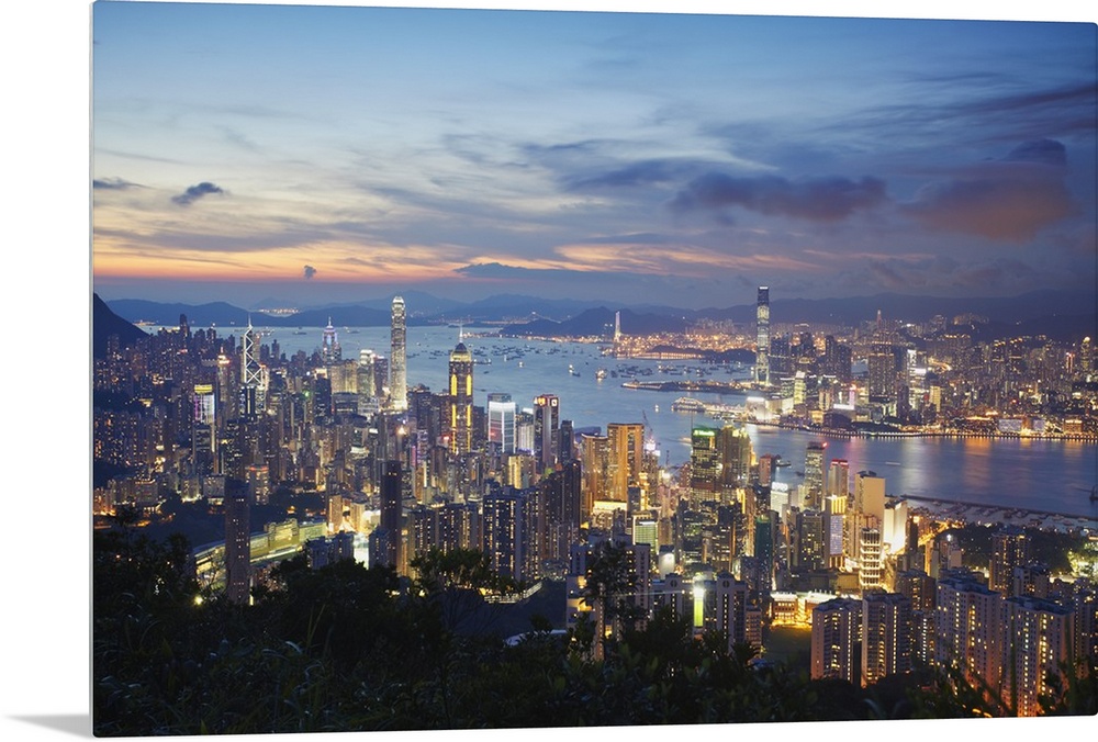 <p>Hong Kong Island and Kowloon skylines at sunset, Hong Kong, China</p>