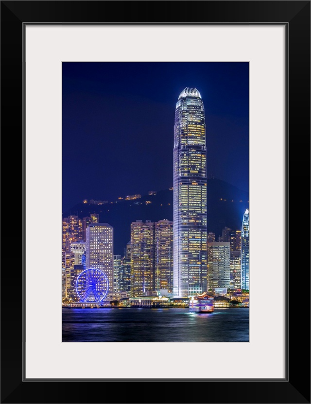 <p>Hong Kong skyline, IFC Tower and skyscrapers on Hong Kong Island at night seen from Tsim Sha Tsui, Hong Kong Island, Hong Kong, China.</p>