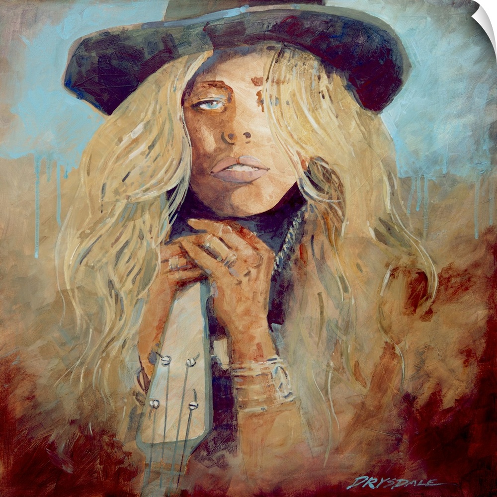<p>Contemporary painting of a woman in a hat with long blonde hair., leaning against a guitar.</p>