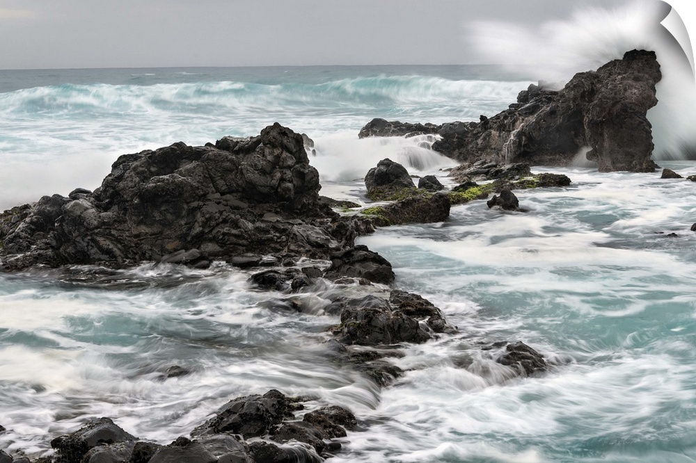 <p>Photograph of waves crashing on large rocks at Ho'okipa beach in Hawaii.</p>