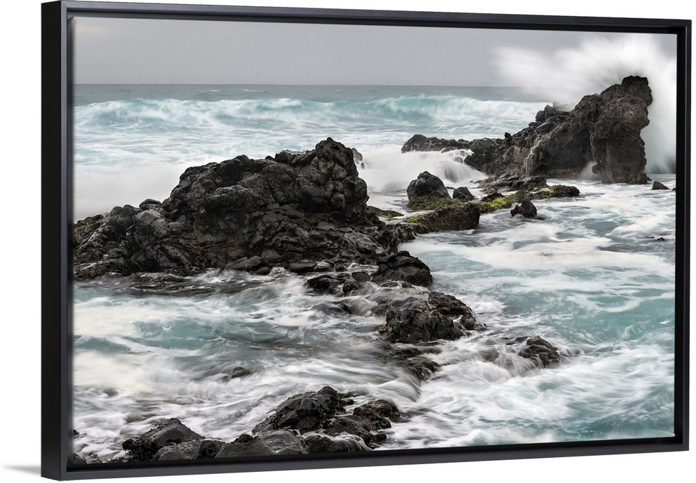 <p>Photograph of waves crashing on large rocks at Ho'okipa beach in Hawaii.</p>